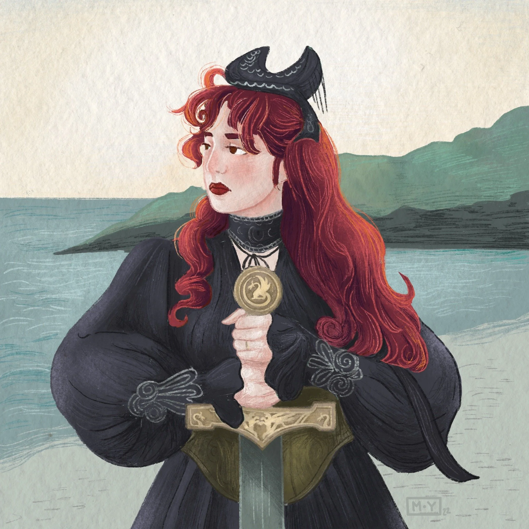 Illustration d’après une oeuvre de la talentueuse photographe @lizabetroberts représentant le youtubeuse Rachel Maksy en costume de chevalière prête à défendre son pays.